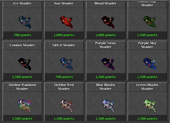 Shaders are visual effects that alter your character's appearance. All shaders give +30 movement speed bonus, except Static Shader which gives +50 movement speed.
